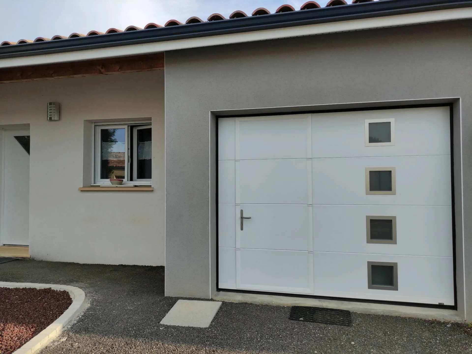 Découvrez ici, notre chantier situé à Saint-Sulpice la pointe (81) pour le remplacement d'une porte de garage sectionnelle avec portillon et hublot motorisée.